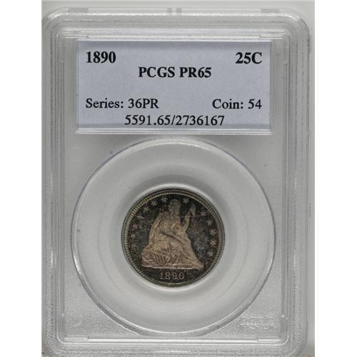 <B>1890 25C PR65 PCGS.</B></I> The striking sharpness is unmistakably that of a proof. Rich layers of electric-blue, golden-brown, and crimson patina cover both sides, but the fields remain glassy and highly reflective.<BR><BR><b>Shipping:</b> Coins & Currency (<a target="_blank" href="http://www.heritageauctions.com/common/shipping.php">view shipping information</a>)