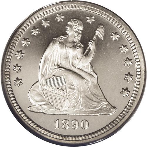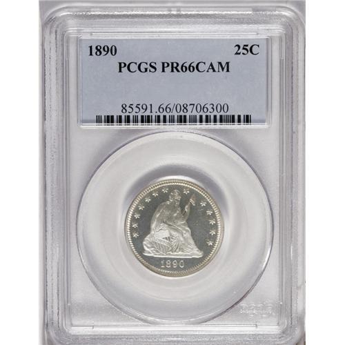 <B>1890<25C> PR66 Cameo PCGS.</B></I> Icy devices confirm the Cameo designation, and post-strike contact is invisible to the unaided eye. A few of the upper stars lack intricate centers, but the strike is otherwise bold. A mere 590 proofs were struck, and the mintage of business strikes was limited to 80,000 pieces. Population: 1 in 66 Cameo, 4 finer (9/06).