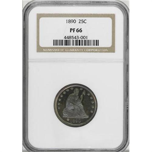 <B>1890 25C PR66 NGC.</B></I> Pale green and bright blue with peripheral rose toning on each side, accentuating the frosty devices and deeply mirrored fields, this gorgeous Premium Gem will delight the connoisseur. The only blemish on either side is a tiny spot left of the date that has created a lighter circular area. Census: 20 in 66, 18 finer (1/08).<BR><BR><B>Coin Engraver:</B> Christian Gobrecht<BR><BR><b>Shipping:</b> Coins & Currency (<a target="_blank" href="http://www.heritageauctions.com/common/shipping.php">view shipping information</a>)