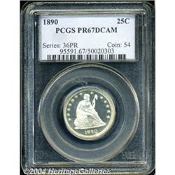 <B>1890<25C> PR67 Deep Cameo PCGS.</B></I> The penultimate proof issue in the Seated Quarter series, this gorgeous Superb Gem combines richly frosted devices with deeply mirrored fields. There is no toning save for some delicate golden tinting in a few isolated peripheral areas, and distracting abrasions are conspicuous by their absence. There are numerous rough unfinished areas within the recesses of the reverse shield, all of which are as made. This coin shares the PR67 Deep Cameo level with three other specimens at PCGS, and there is only one graded finer (3/04).<BR><I>Ex: Charlotte ANA Signature Sale (Heritage, 3/03), lot 5720, which realized $10,062.50.</B></I><BR><I>From the JFS Collection.</B></I> <BR><BR><B>Important notice:</B> Heritage usually auctions material at the rate of 200-250 lots per hour. On some occasions eBay Live bid software or the Internet may not be able to keep up with the pace of the auction. We recommend placing a realistic absentee bid now as insurance to avoid disappointment. Occasionally the auctioneer may eliminate or reject an eBay Live bid, and the auctioneer may also reopen a lot after the close of the eBay live bidding (usually because we missed an audience bid), and may reject your bid even if it shows you as the winning bidder. By bidding via eBay Live, you agree that Heritage may award the lot to another bidder at its sole discretion under the circumstances described above or any other reasonable circumstances. Since eBay bids are not shown to us until we open the lot on the floor, we treat those bids just like floor bids. In most cases the floor responds before the eBay bid is presented to us, due to Internet lag time, so for consistency we have made it a policy that floor bids are always considered first over tie eBay live bids. Also please note that all Heritage lots purchased through eBay Live carry a 20% Buyer's Premium. Please make sure you read the Terms and Conditions before you bid. </span></font></tr></table></td></tr></table>