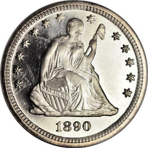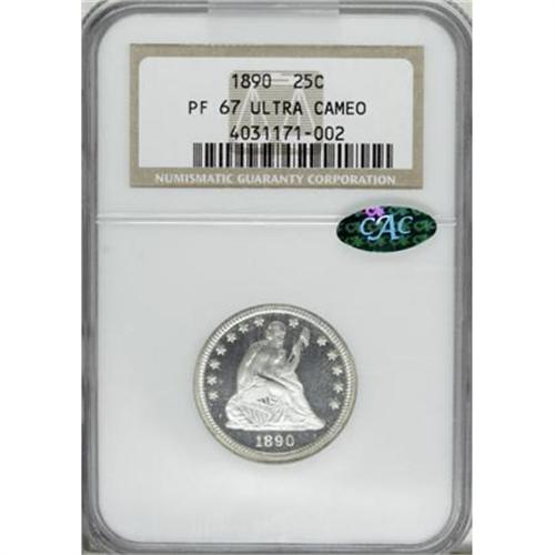 <B>1890 25C PR67 Ultra Cameo NGC. CAC.</B></I> The radiant white devices display exceptional contrast with the flashy and seamless fields. A magnificent Superb Gem that is worthy of the finest specialized holding. Just 590 proofs were struck, and business strikes are also elusive due to a small production of 80,000 pieces. Census: 10 in 67, 6 finer (1/08).<BR><BR><b>Shipping:</b> Coins & Currency (<a target="_blank" href="http://www.heritageauctions.com/common/shipping.php">view shipping information</a>)