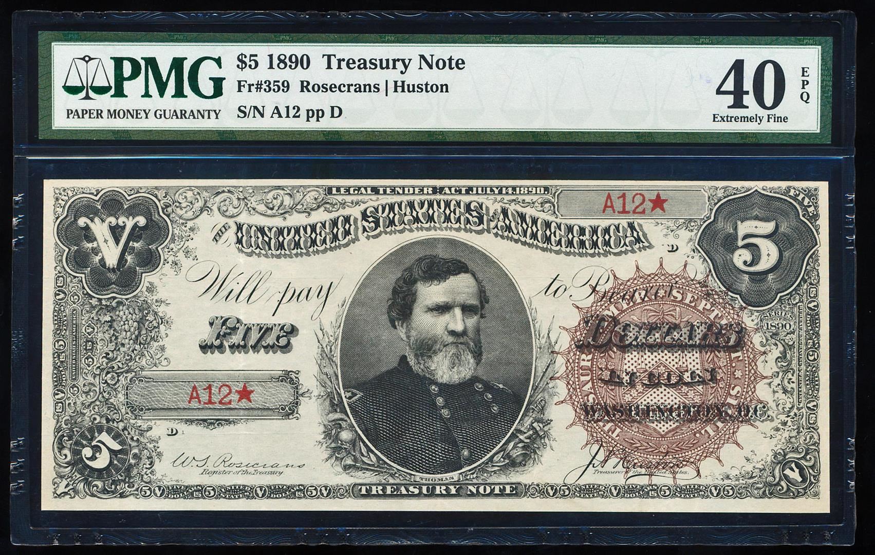 One 1890 $5 Treasury Note Fr.359 PMG Extremely Fine 40EPQ. PMG Certified.