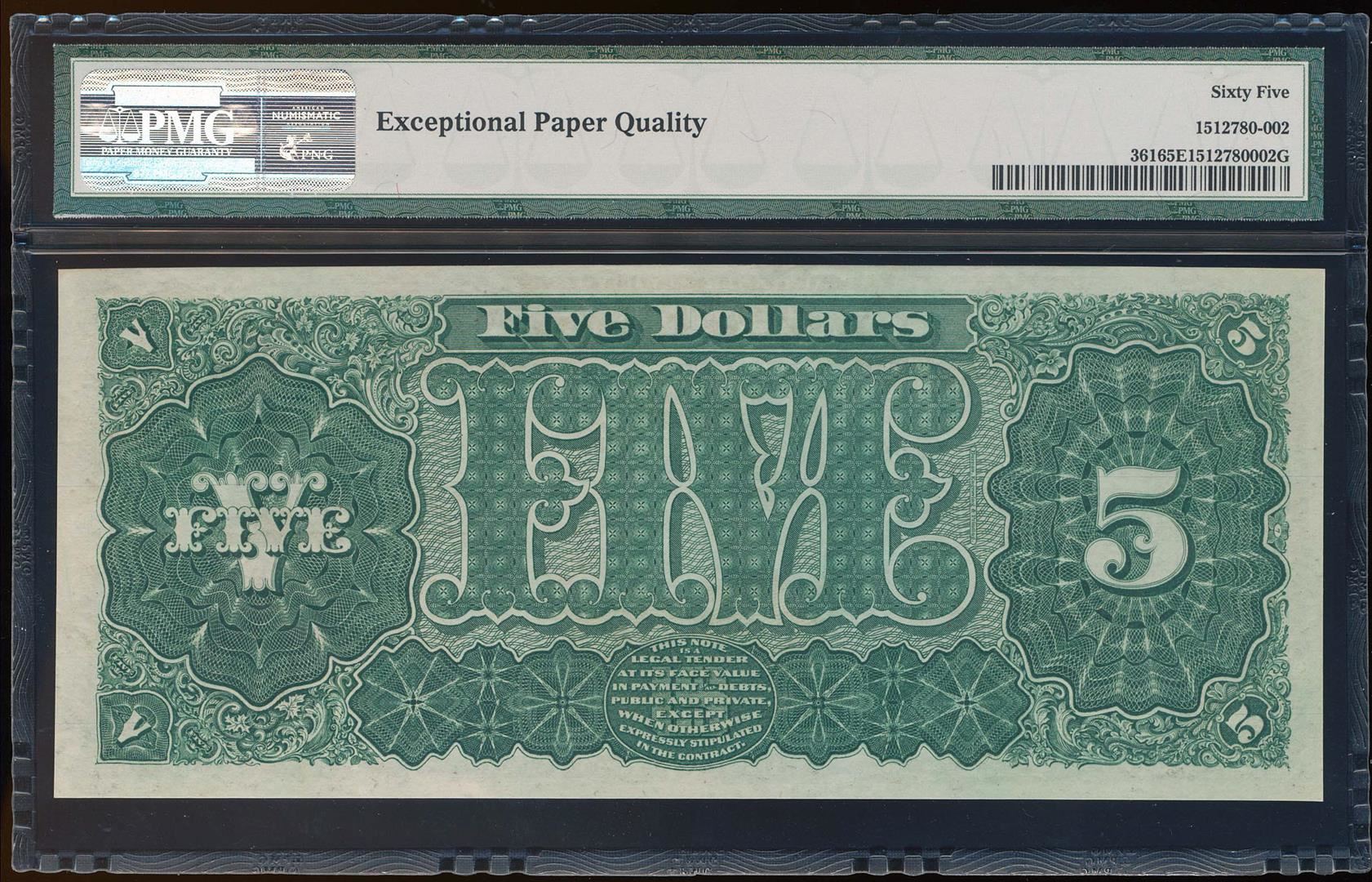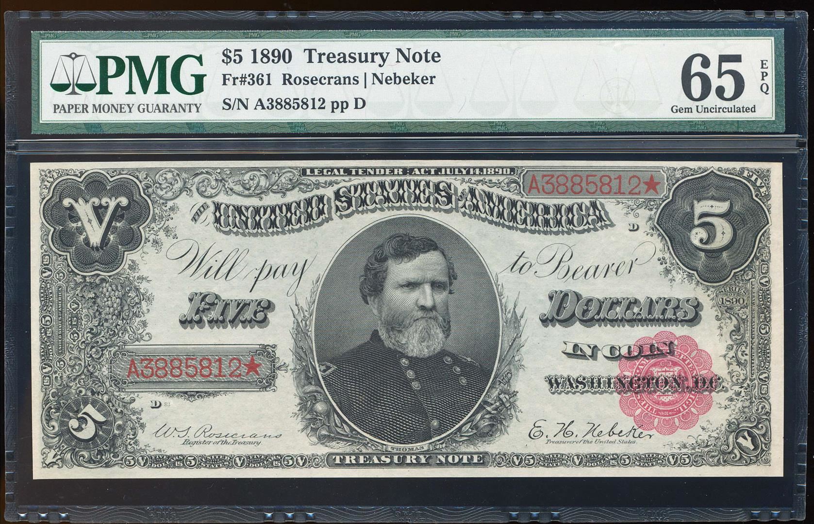 This 1890 $5 Treasury Note Fr.361 PMG graded Gem Uncirculated 65EPQ. Wide margins, along with great ink and paper colors are attributes of this $5 Treasury note that features the ornate back design and has a small red Treasury seal. PMG Certified.
