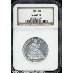 <B>1890<50C> MS65 Prooflike NGC.</B></I> Frosty devices and moderately reflective fields confirm the Prooflike status of this virtually untoned and sharply struck Gem. A speck of granular gray patina is noted on the drapery near the Y in LIBERTY. A mere 12,000 business strikes were produced in 1890, the last of the ultra-low mintage dates caused by heavy Morgan Dollar production. Population: 1 in 65 Prooflike, 3 finer (7/04). <BR><BR><B>Important notice:</B> Heritage usually auctions material at the rate of 200-250 lots per hour. On some occasions eBay Live bid software or the Internet may not be able to keep up with the pace of the auction. We recommend placing a realistic absentee bid now as insurance to avoid disappointment. Occasionally the auctioneer may eliminate or reject an eBay Live bid, and the auctioneer may also reopen a lot after the close of the eBay live bidding (usually because we missed an audience bid), and may reject your bid even if it shows you as the winning bidder. By bidding via eBay Live, you agree that Heritage may award the lot to another bidder at its sole discretion under the circumstances described above or any other reasonable circumstances. Since eBay bids are not shown to us until we open the lot on the floor, we treat those bids just like floor bids. In most cases the floor responds before the eBay bid is presented to us, due to Internet lag time, so for consistency we have made it a policy that floor bids are always considered first over tie eBay live bids. Also please note that all Heritage lots purchased through eBay Live carry a 20% Buyer's Premium. Please make sure you read the Terms and Conditions before you bid. </span></font></tr></table></td></tr></table>