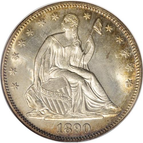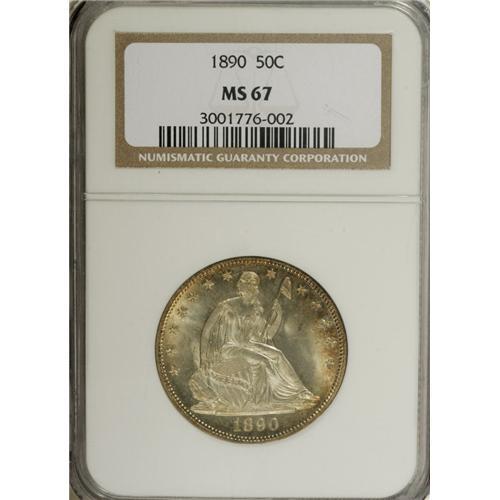 <B>1890 50C MS67 NGC.</B></I> This is a scarce date that is seldom found in any Mint State grade, let alone Superb Gem. The example offered here has satin luster with reflective fields and light gold toning along the borders. A tiny blemish in the right obverse field has prevented a higher grade, as the balance of the obverse and reverse are essentially mark-free. Census: 6 in 67, 1 finer (2/07).<BR><BR><b>Shipping:</b> Coins & Currency (<a target="_blank" href="http://www.heritageauctions.com/common/shipping.php">view shipping information</a>)