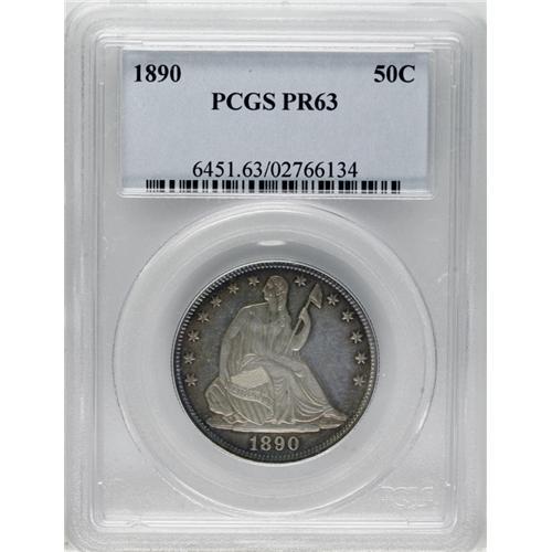 <B>1890 50C PR63 PCGS.</B></I> Exquisitely struck with warm sunset-orange toning in the centers and deep blue-violet peripheral patina. Each side has heavily frosted devices that create surprising contrast with the fields.<BR><BR><b>Shipping:</b> Coins & Currency (<a target="_blank" href="http://www.heritageauctions.com/common/shipping.php">view shipping information</a>)