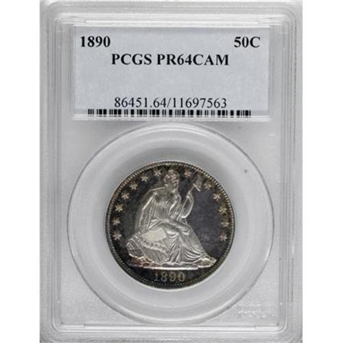 <B>1890 50C PR64 Cameo PCGS.</B></I> A lovely near-Gem representative from the penultimate proof Seated half dollar issue. Strongly reflective with distinct contrast despite deep rose and amethyst patina at the margins. Minor hairlines in the fields preclude a finer grade. Population: 10 in 64 Cameo, 9 finer (4/07).<BR><BR><b>Shipping:</b> Coins & Currency (<a target="_blank" href="http://www.heritageauctions.com/common/shipping.php">view shipping information</a>)