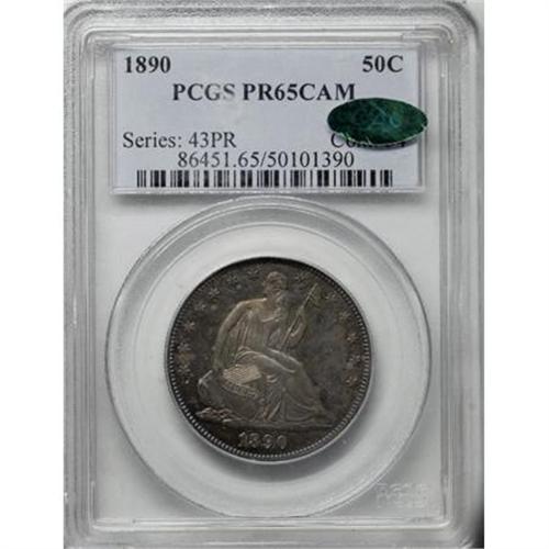 <B>1890 50C PR65 Cameo PCGS. CAC.</B></I> A couple hundred or so of 1890 proof half dollars out of a mintage of 590 pieces have been seen by PCGS and NGC. Cameo examples, especially those of Gem quality, however, are quite scarce. Whispers of light tan patina with cobalt-blue and lavender accents at the peripheries grace both sides, as do exquisitely struck design elements. Excellent field-design contrast, and no mentionable contact marks. Population: 6 in 65 Cameo, 3 finer (11/07).<BR><I>From The Kallenberg #1 PCGS Registry Set Of Proof Half Dollars.</B></I><BR><BR><b>Shipping:</b> Coins & Currency (<a target="_blank" href="http://www.heritageauctions.com/common/shipping.php">view shipping information</a>)
