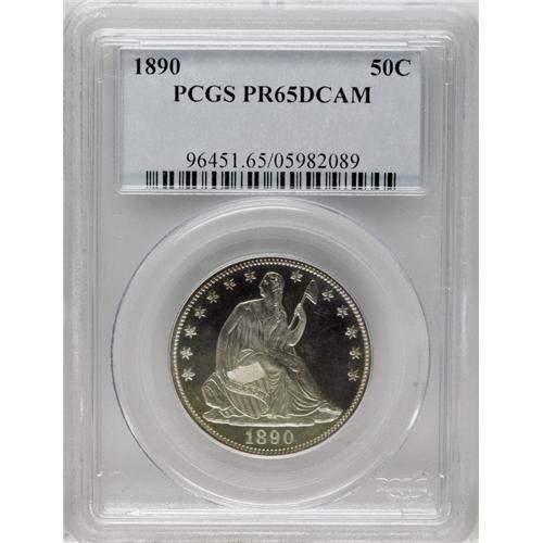 <B>1890 50C PR65 Deep Cameo PCGS.</B></I> The 1890 is rarely encountered with Deep Cameo contrast, only two other pieces have been so graded by PCGS and two are finer (1/07). Last of the low total-mintage dates in the Seated half series, a mere 12,000 business strikes were produced along with 590 proofs. Mostly brilliant, this lovely Gem shows the white-on-black cameo effect to its best effect with no significant toning present to obscure it. A pristine proof that actually appears even finer than the stated grade.<BR><BR><b>Shipping:</b> Coins & Currency (<a target="_blank" href="http://www.heritageauctions.com/common/shipping.php">view shipping information</a>)