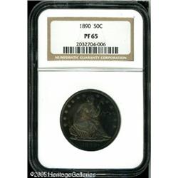 <B>1890 50C PR65 NGC.</B></I> Deep multicolored toning on the obverse and reverse, with the centers showing a splash of lighter rose-gold, while the periphery is dark blue and gray. We note an old thin line in the right obverse field which extends onto Liberty's leg, and a few trace hairlines visible with a glass. Scarce and in demand in Gem grades. Lot:7116