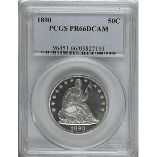 <B>1890 50C PR66 Deep Cameo PCGS.</B></I> The silver lobby and the Bland-Allison Act of 1878 explain several mysteries in late 19th century numismatics. The Act required the government to purchase between 2 and 4 million ounces of newly coined silver each month. What this translated into is enormous mintages for silver dollars, as a silver dollar was heavier than two halves, four quarters, or 10 dimes. As a result, mintages for lower denomination silver coins from 1878 through 1890 were remarkably low for the most part. The year 1890 was the final year for lower production numbers for half dollars. Still, only 12,000 circulation strikes were produced, plus 590 proofs. This is an outstanding Deep Cameo proof. The fields are deeply reflective and all the devices on each side show thick mint frost. The result is a profound white-on-black cameo effect. Population: 1 in 66, 1 finer (8/07).<BR><BR><b>Shipping:</b> Coins & Currency (<a target="_blank" href="http://www.heritageauctions.com/common/shipping.php">view shipping information</a>)