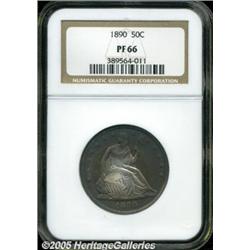 <B>1890 50C PR66 NGC.</B></I> The luminous rose-gray centers are framed by deep cobalt-blue peripheries. A razor-sharp specimen with lovely eye appeal and virtually undisturbed surfaces. A stingy 590 proofs were issued, and the business strike production of 12,000 pieces is also quite low. Population: 15 in 66, 11 finer (2/05).