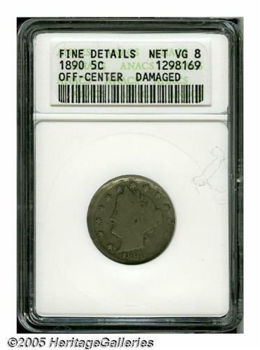 <B>1890<5C> Liberty Nickel--Off Center, Damaged--ANACS. Fine Details, Net VG8.</B></I> Struck slightly off center toward 3 o'clock, the pearl-gray has a wide area of unstruck surface at 9 o'clock. The rims are somewhat bruised, and a thin, circular groove along the right obverse border appears to be of post-strike origin.
