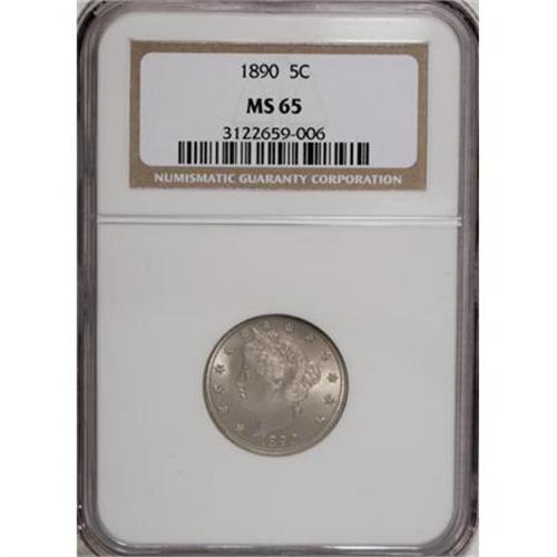 <B>1890 5C MS65 NGC.</B></I> A veneer of light tan color resides on the lustrous surfaces of this sharply struck, gorgeous nickel. Nicely struck throughout, with minimum ticks on the frosty finish. Census: 41 in 65, 13 finer (1/08).<BR><I>From The John Stimson, Sr. Collection, Part Two.</B></I><BR><BR><B>Coin Engraver:</B> Charles E. Barber<BR><BR><b>Shipping:</b> Coins & Currency (<a target="_blank" href="http://www.heritageauctions.com/common/shipping.php">view shipping information</a>)