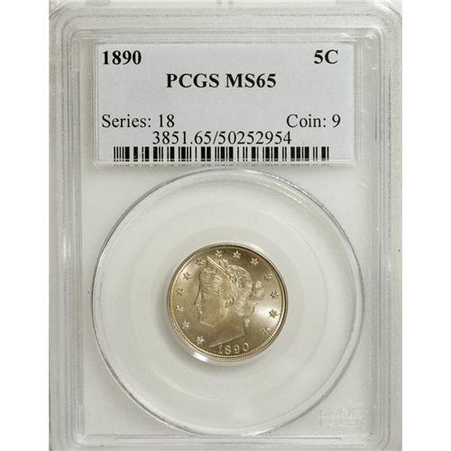 <B>1890 5C MS65 PCGS.</B></I> Supremely lustrous, with traces of faint toning and few surface marks. The design elements are well struck, except for slight weakness on obverse star 7 and on the left reverse ear of corn. Population: 43 in 65, 10 finer (4/07).<BR><BR><b>Shipping:</b> Coins & Currency (<a target="_blank" href="http://www.heritageauctions.com/common/shipping.php">view shipping information</a>)