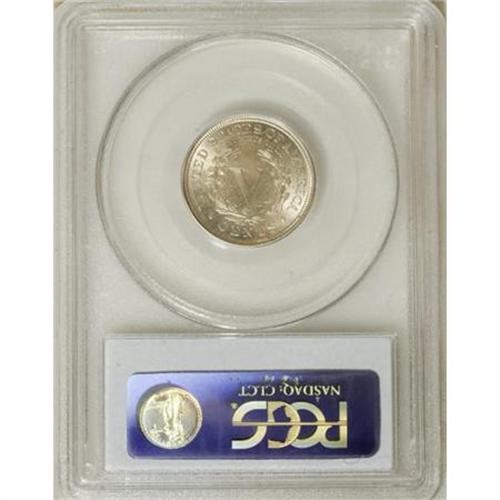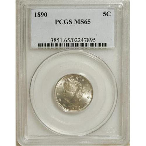 <B>1890 5C MS65 PCGS.</B></I> Soft, swirling luster with delicate nickel-gray and sage patina over each side. Slightly hazy, yet well-defined with excellent eye appeal. Population: 50 in 65, 10 finer (2/08).<BR><BR><B>Coin Engraver:</B> Charles E. Barber<BR><BR><b>Shipping:</b> Coins & Currency (<a target="_blank" href="http://www.heritageauctions.com/common/shipping.php">view shipping information</a>)