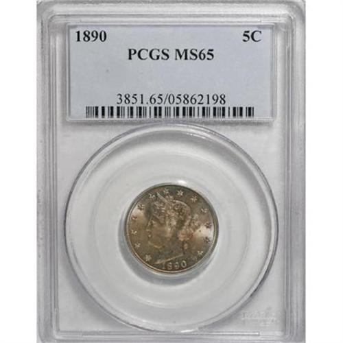 <B>1890 5C MS65 PCGS.</B></I> Vivid yellow-orange and pink-magenta shadings enliven the obverse, while the satiny reverse is largely nickel-gray with occasional elements of green. Well struck and pleasing, a solid Gem. Population: 49 in 65, 10 finer (3/08).<BR><BR><B>Coin Engraver:</B> Charles E. Barber<BR><BR><b>Shipping:</b> Coins & Currency (<a target="_blank" href="http://www.heritageauctions.com/common/shipping.php">view shipping information</a>)