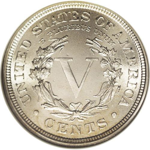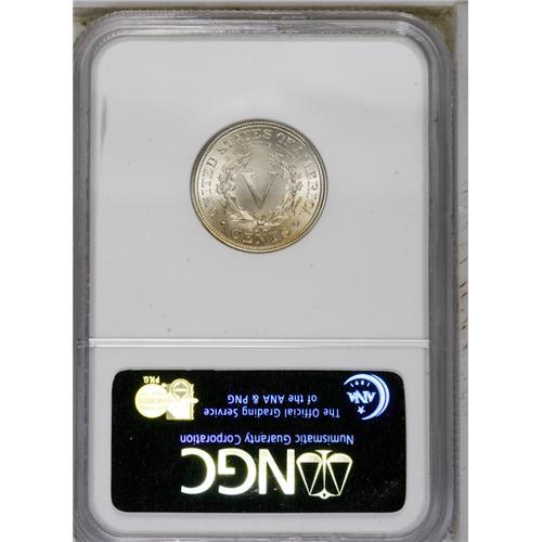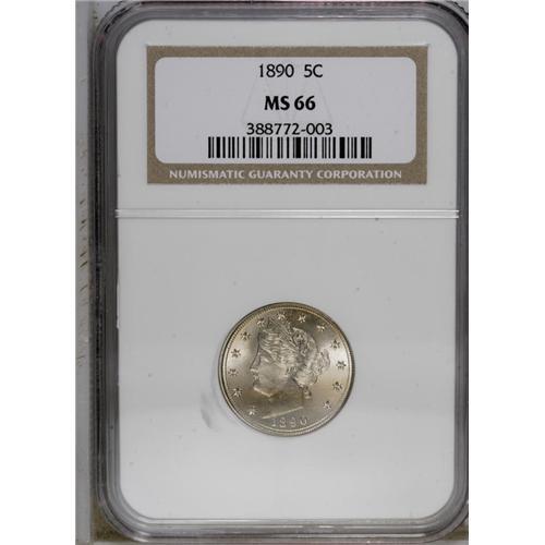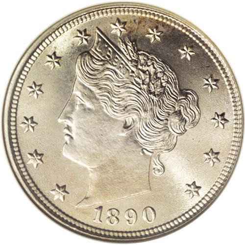 <B>1890<5C> MS66 NGC.</B></I> This lovely nickel has frosty gray color with intermingled gold and iridescent toning. Both sides are well struck, and even the lower left portion of the wreath is sharper than usual and nearly fully defined. NGC and PCGS combined have certified only 20 pieces at the MS66 level, with just a single example graded finer (9/06).