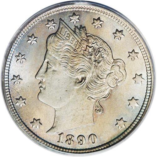 <B>1890<5C> MS66 PCGS.</B></I> The highly lustrous surfaces are adorned by pleasingly variegated toning over both sides. Tan, sky-blue, amber, and rose are among the colors that help to ensure the eye appeal of this noteworthy Premium Gem. Softly struck on the reverse left ear of corn, and on some of the obverse stars, but well detailed in the centers. The glowing, matte-like surfaces seem pristine. Population: 9 in 66, 0 finer (8/06).
