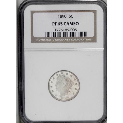 <B>1890<5C> PR65 Cameo NGC.</B></I> A moderately reflective Gem that offers pleasing contrast. The obverse patina has pale blue to the left and champagne to the right. Census: 20 in 65 Cameo, 16 finer (8/06).