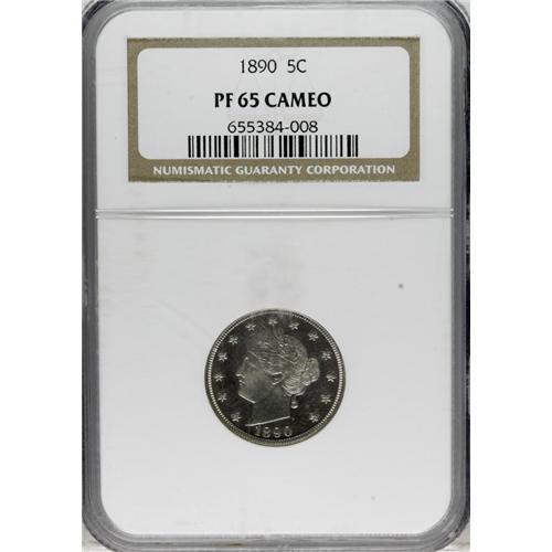 <B>1890 5C PR65 Cameo NGC.</B></I> The 1890 Liberty nickel is not as rare as some other dates in cameo proof, yet it is still elusive. Only about one of seven submissions receive a Cameo designation. This is a lovely Gem with hints of lilac and blue color over light nickel gray surfaces. Both sides exhibit full contrast. Census: 20 in 65 Cameo, 16 finer (4/07).<BR><BR><b>Shipping:</b> Coins & Currency (<a target="_blank" href="http://www.heritageauctions.com/common/shipping.php">view shipping information</a>)