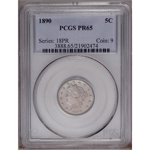 <B>1890<5C> PR65 PCGS.</B></I> Ice-blue and salmon-pink tints adorn this suitably struck Gem. A couple of faint marks near PLURIBUS, but otherwise immaculate. Population: 63 in 65, 11 finer (1/06).