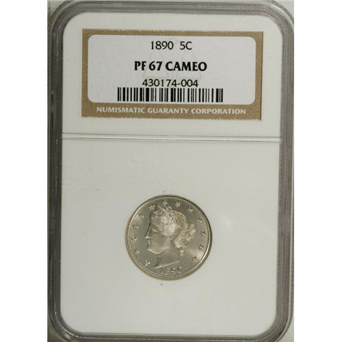 <B>1890 5C PR67 Cameo NGC.</B></I> Brilliant silver-white surfaces, frosty devices, and superb luster are the hallmarks of this enchanting Superb Gem from early in the Liberty nickel series. The strike is bold, save for on that problematic left ear of corn. This piece is one of only two so graded at NGC, with none at PCGS (12/06).<BR><I>From The Paul Vine Collection.</B></I><BR><BR><b>Shipping:</b> Coin/Currency (<a target="_blank" href="http://www.heritageauctions.com/common/shipping.php">view shipping information</a>)