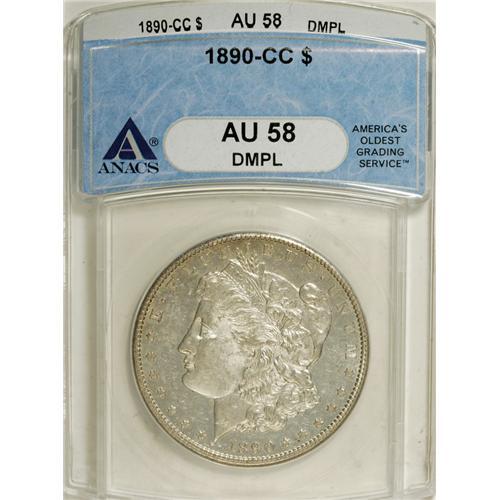 <B>1890-CC $1 AU58 Deep Mirror Prooflike ANACS.</B></I> NGC Census: (2/376). PCGS Population (0/742). (#97199)<BR><BR><b>Shipping:</b> Coins & Currency (<a target="_blank" href="http://www.heritageauctions.com/common/shipping.php">view shipping information</a>)