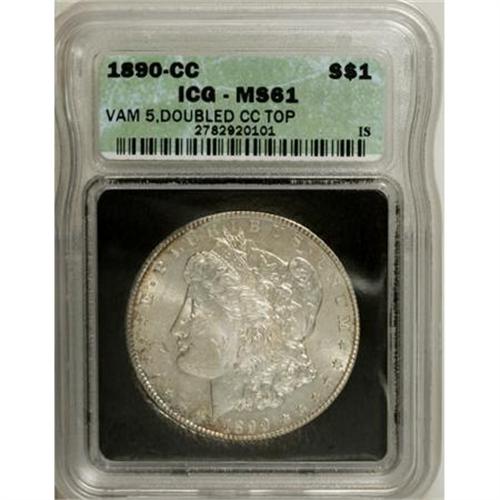 <B>1890-CC $1 MS61 ICG.</B></I> VAM-5, Doubled CC. Top-50. NGC Census: (266/2809). PCGS Population (485/6310). Mintage: 2,309,041. Numismedia Wsl. Price for NGC/PCGS coin in MS61: $375. (#7198)<BR><BR><B>Coin Engraver:</B> George T. Morgan<BR><BR><b>Shipping:</b> Coins & Currency (<a target="_blank" href="http://www.heritageauctions.com/common/shipping.php">view shipping information</a>\)