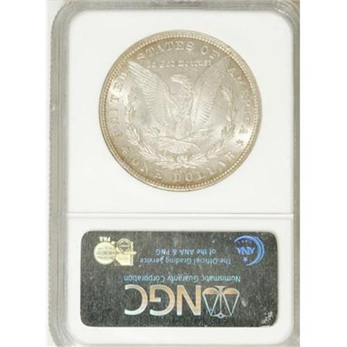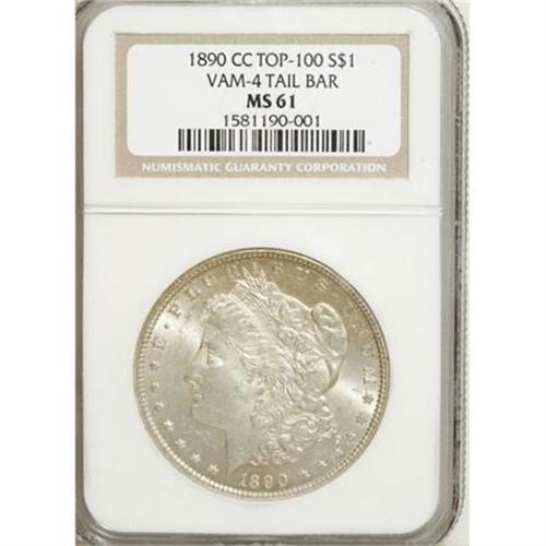 <B>1890-CC $1 Tail Bar MS61 NGC.</B></I> VAM-4. A Top 100 Variety. The "Tail Bar" 1890-CC variant gets its moniker from a bold die gouge that connects the eagle's leftmost tailfeather with the wreath. Well struck with light haze over softly lustrous silver-gray and gold-orange surfaces that show a number of wispy abrasions.<BR><BR><b>Shipping:</b> Coins & Currency (<a target="_blank" href="http://www.heritageauctions.com/common/shipping.php">view shipping information</a>)