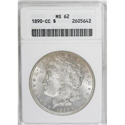 <B>1890-CC $1 MS62 ANACS.</B></I> NGC Census: (838/1943). PCGS Population (1795/4469). Mintage: 2,309,041. Numismedia Wsl. Price for NGC/PCGS coin in MS62: $475. (#7198)<BR><BR><B>Coin Engraver:</B> George T. Morgan<BR><BR><b>Shipping:</b> Coins & Currency (<a target="_blank" href="http://www.heritageauctions.com/common/shipping.php">view shipping information</a>\)
