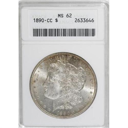 <B>1890-CC $1 MS62 ANACS.</B></I> NGC Census: (838/1943). PCGS Population (1795/4469). Mintage: 2,309,041. Numismedia Wsl. Price for NGC/PCGS coin in MS62: $475. (#7198)<BR><BR><B>Coin Engraver:</B> George T. Morgan<BR><BR><b>Shipping:</b> Coins & Currency (<a target="_blank" href="http://www.heritageauctions.com/common/shipping.php">view shipping information</a>\)