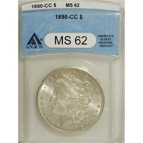<B>1890-CC $1 MS62 ANACS.</B></I> NGC Census: (844/1965). PCGS Population (1808/4502). Mintage: 2,309,041. Numismedia Wsl. Price for NGC/PCGS coin in MS62: $475. (#7198)<BR><BR><B>Coin Engraver:</B> George T. Morgan<BR><BR><b>Shipping:</b> Coins & Currency (<a target="_blank" href="http://www.heritageauctions.com/common/shipping.php">view shipping information</a>\)