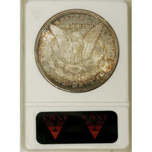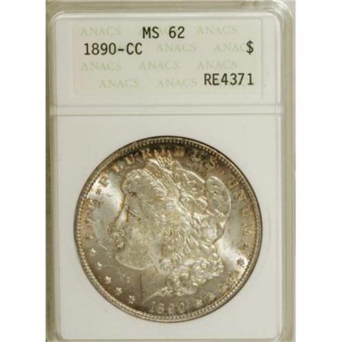 <B>1890-CC $1 MS62 ANACS.</B></I> Crisply struck with flashy luster and an excellent appearance overall. The margins of this Carson City dollar exhibit a pleasing blend of gold, rose, and plum, while the lightly abraded centers are untoned.<BR><BR><B>Coin Engraver:</B> George T. Morgan<BR><BR><b>Shipping:</b> Coins & Currency (<a target="_blank" href="http://www.heritageauctions.com/common/shipping.php">view shipping information</a>)
