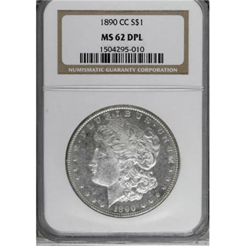 <B>1890-CC $1 MS62 Deep Mirror Prooflike NGC.</B></I> Although the surfaces are somewhat abraded, deeply mirrored fields serve as a fine background for the lustrous devices.<BR><BR><b>Shipping:</b> Coins & Currency (<a target="_blank" href="http://www.heritageauctions.com/common/shipping.php">view shipping information</a>)