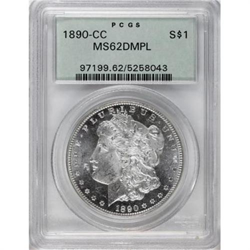 <B>1890-CC $1 MS62 Deep Mirror Prooflike PCGS.</B></I> VAM-3. The 90 in the date is recut southwest. An essentially brilliant and deeply mirrored Carson City dollar with moderately frosted devices. The cheek and neck display marks suitable for the grade. Housed in a green label holder.<BR><BR><b>Shipping:</b> Coins & Currency (<a target="_blank" href="http://www.heritageauctions.com/common/shipping.php">view shipping information</a>)