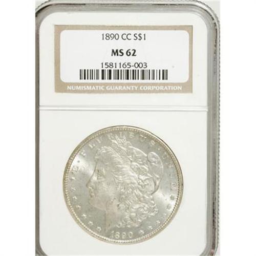 <B>1890-CC $1 MS62 NGC.</B></I> NGC Census: (856/1987). PCGS Population (1827/4637). Mintage: 2,309,041. Numismedia Wsl. Price for NGC/PCGS coin in MS62: $475. (#7198)<BR><BR><B>Coin Engraver:</B> George T. Morgan<BR><BR><b>Shipping:</b> Coins & Currency (<a target="_blank" href="http://www.heritageauctions.com/common/shipping.php">view shipping information</a>)