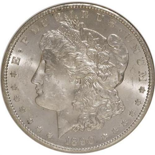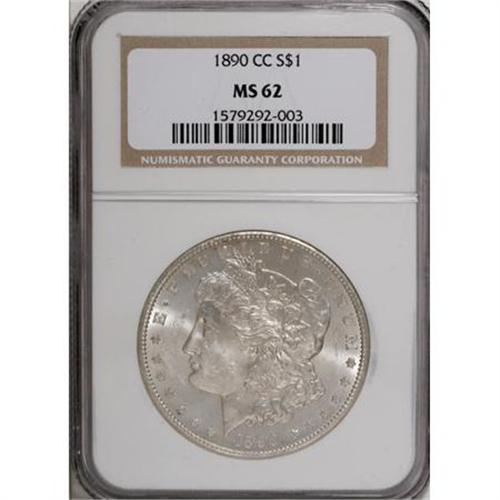 <B>1890-CC $1 MS62 NGC.</B></I> . NGC Census: (883/2044). PCGS Population (1827/4798). Mintage: 2,309,041. Numismedia Wsl. Price for NGC/PCGS coin in MS62: $500. (#7198)<BR><BR><B>Coin Engraver:</B> George T. Morgan<BR><BR><b>Shipping:</b> Coins & Currency (<a target="_blank" href="http://www.heritageauctions.com/common/shipping.php">view shipping information</a>)