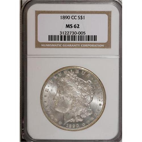 <B>1890-CC $1 MS62 NGC.</B></I> . NGC Census: (885/2039). PCGS Population (1831/4831). Mintage: 2,309,041. Numismedia Wsl. Price for NGC/PCGS coin in MS62: $500. (#7198)<BR><BR><B>Coin Engraver:</B> George T. Morgan<BR><BR><b>Shipping:</b> Coins & Currency (<a target="_blank" href="http://www.heritageauctions.com/common/shipping.php">view shipping information</a>)