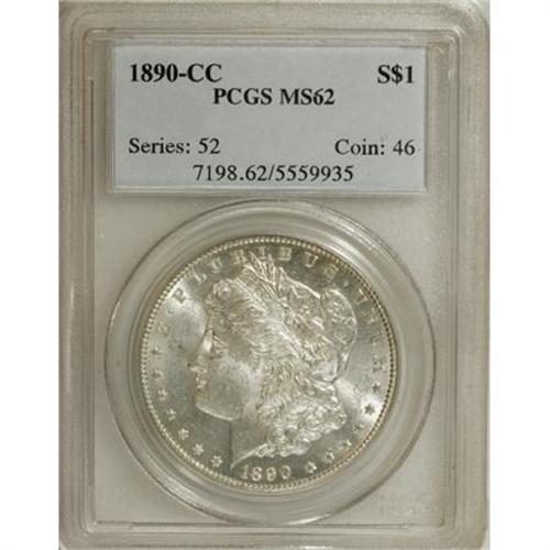<B>1890-CC $1 MS62 PCGS.</B></I> PCGS Population (1809/4532). NGC Census: (852/1980). Mintage: 2,309,041. Numismedia Wsl. Price for NGC/PCGS coin in MS62: $475. (#7198)<BR><BR><B>Coin Engraver:</B> George T. Morgan<BR><BR><b>Shipping:</b> Coins & Currency (<a target="_blank" href="http://www.heritageauctions.com/common/shipping.php">view shipping information</a>)