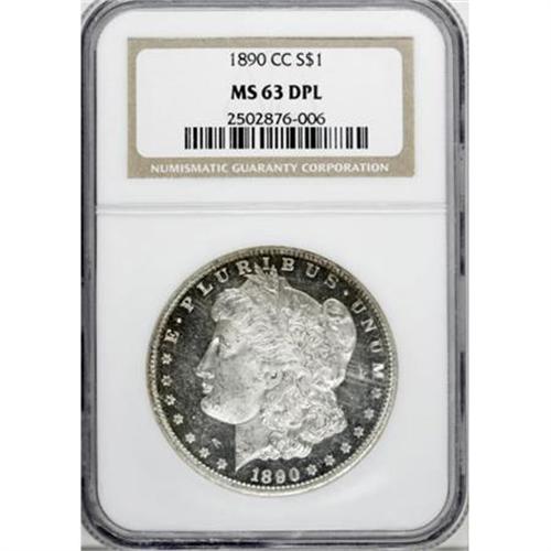 <B>1890-CC $1 MS63 Deep Mirror Prooflike NGC.</B></I> VAM-3. The 90 in the date is lightly recut southwest. A white-on-black dazzler with original peripheral peach and sea-green toning. The eagle's breast displays parallel roller marks, as produced.<BR><BR><b>Shipping:</b> Coins & Currency (<a target="_blank" href="http://www.heritageauctions.com/common/shipping.php">view shipping information</a>)