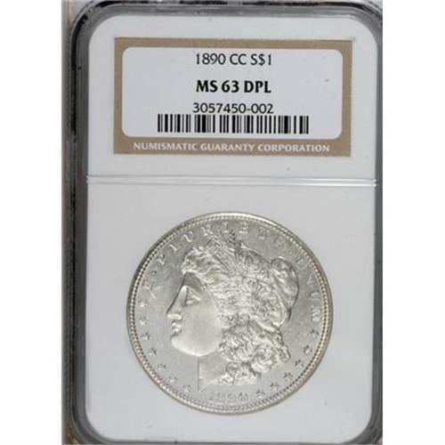 <B>1890-CC $1 MS63 Deep Mirror Prooflike NGC.</B></I> A few speckles of milky color visit the obverse of this deeply mirrored Select Morgan. The design elements show the usual sharp strike, evidenced by nice definition in the hair at Liberty's ear and on the eagle's breast feathers. A few luster grazes define the grade. One of the rarest and most desired issues among Carson City Morgan dollars.<BR><BR><b>Shipping:</b> Coins & Currency (<a target="_blank" href="http://www.heritageauctions.com/common/shipping.php">view shipping information</a>)