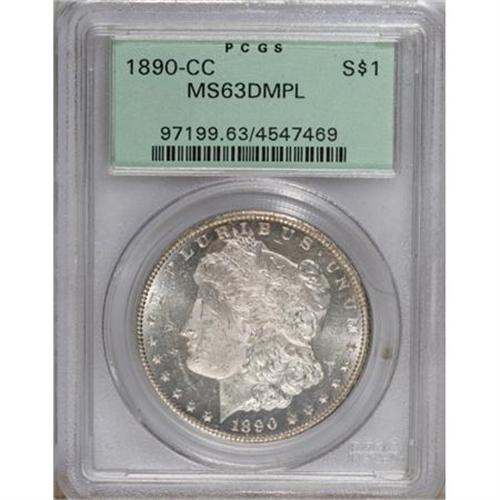 <B>1890-CC $1 MS63 Deep Mirror Prooflike PCGS.</B></I> A flashy better-date Carson City dollar with an attentive strike and a well preserved reverse. Traces of gold toning prevent full brilliance. Housed in a green label holder.<BR><BR><b>Shipping:</b> Coins & Currency (<a target="_blank" href="http://www.heritageauctions.com/common/shipping.php">view shipping information</a>)