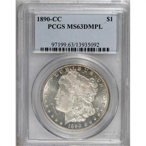 <B>1890-CC $1 MS63 Deep Mirror Prooflike PCGS.</B></I> This better date Carson City dollar has profoundly mirrored fields and only a hint of obverse gold toning. A boldly struck Select example with a few minor grazes throughout the left obverse.<BR><BR><b>Shipping:</b> Coins & Currency (<a target="_blank" href="http://www.heritageauctions.com/common/shipping.php">view shipping information</a>)