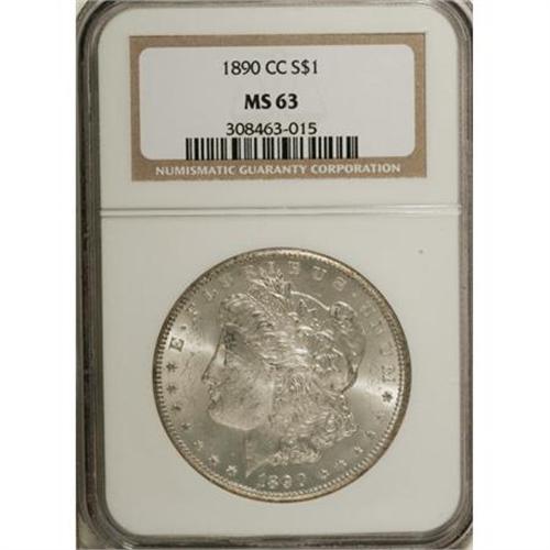 <B>1890-CC $1 MS63 NGC.</B></I> A crisply struck Select representative from the waning years of the Carson City Mint, strongly lustrous with a hint of frost on the highpoints. Light, scattered abrasions affect each side, and a patch of roller marks appears on the chin.<BR><BR><b>Shipping:</b> Coins & Currency (<a target="_blank" href="http://www.heritageauctions.com/common/shipping.php">view shipping information</a>)