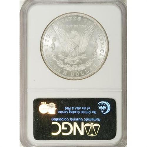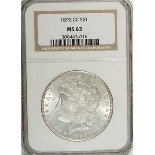 <B>1890-CC $1 MS63 NGC.</B></I> An attractive Carson City dollar in Select Mint State condition. Essentially untoned, with dynamic cartwheel luster in the fields, and a well preserved reverse. The obverse shows a few grade-limiting marks, mainly on Liberty's face and in the upper left obverse field. <BR><BR><b>Shipping:</b> Coins & Currency (<a target="_blank" href="http://www.heritageauctions.com/common/shipping.php">view shipping information</a>)