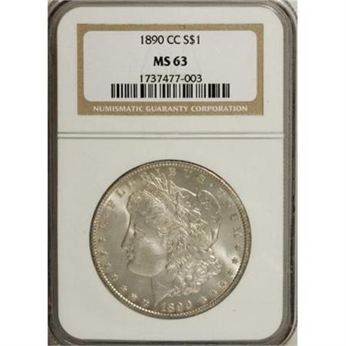 <B>1890-CC $1 MS63 NGC.</B></I> NGC Census: (1143/822). PCGS Population (2596/1906). Mintage: 2,309,041. Numismedia Wsl. Price for NGC/PCGS coin in MS63: $750. (#7198)<BR><BR><B>Coin Engraver:</B> George T. Morgan<BR><BR><b>Shipping:</b> Coins & Currency (<a target="_blank" href="http://www.heritageauctions.com/common/shipping.php">view shipping information</a>\)