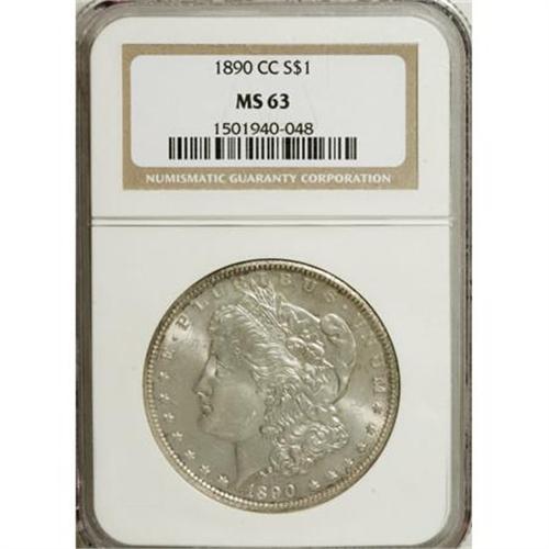 <B>1890-CC $1 MS63 NGC.</B></I> A solidly struck Select representative of this later Carson City silver dollar issue, lightly toned silver-blue with elements of sea-green. Uncommonly appealing for the grade with few marks, particularly on the devices.<BR><BR><B>Coin Engraver:</B> George T. Morgan<BR><BR><b>Shipping:</b> Coins & Currency (<a target="_blank" href="http://www.heritageauctions.com/common/shipping.php">view shipping information</a>)