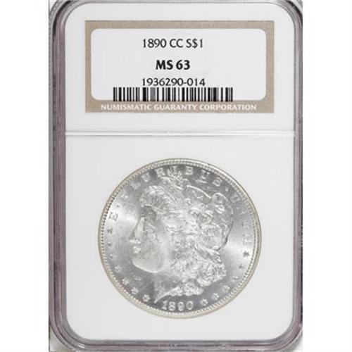 <B>1890-CC $1 MS63 NGC.</B></I> Powerful luster and practically untoned surfaces are the prime draws for this Carson City Morgan dollar. A well-defined example that has light, scattered abrasions on the portrait and in the fields.<BR><BR><B>Coin Engraver:</B> George T. Morgan<BR><BR><b>Shipping:</b> Coins & Currency (<a target="_blank" href="http://www.heritageauctions.com/common/shipping.php">view shipping information</a>)