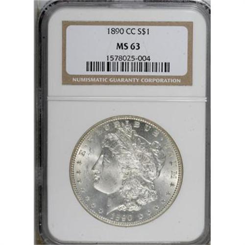 <B>1890-CC $1 MS63 NGC.</B></I> NGC Census: (1158/829). PCGS Population (2656/1947). Mintage: 2,309,041. Numismedia Wsl. Price for NGC/PCGS coin in MS63: $715. (#7198)<BR><BR><B>Coin Engraver:</B> George T. Morgan<BR><BR><b>Shipping:</b> Coins & Currency (<a target="_blank" href="http://www.heritageauctions.com/common/shipping.php">view shipping information</a>)